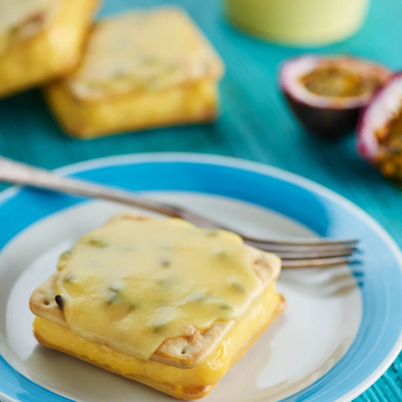 A true Aussie favourite, the humble Vanilla Slice is made better with the delicious crunch and taste of Arnott's Sao Biscuits. A twist of passionfruit brings a delicious fruity taste for a tasty summer snack.