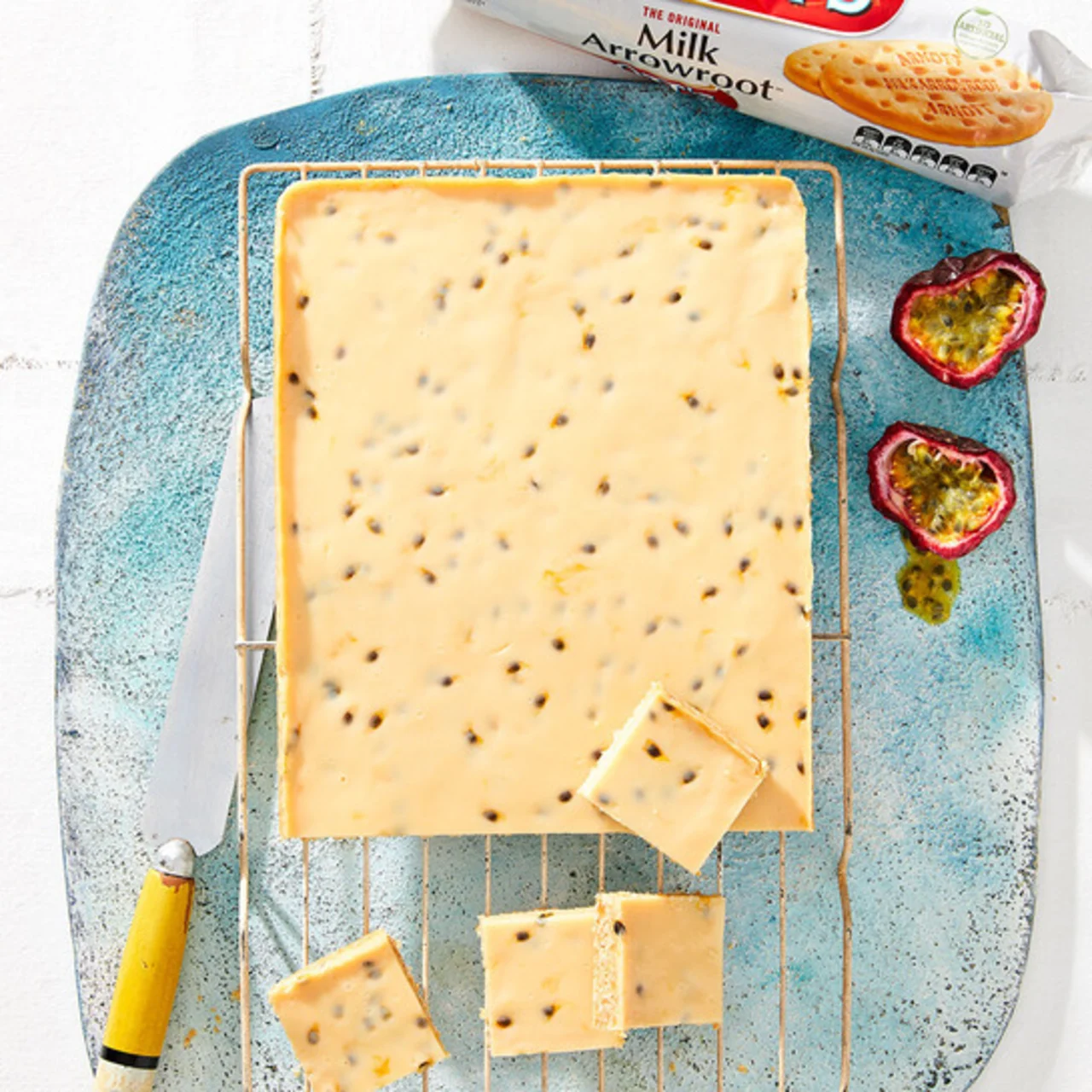A creamy passionfruit slice made with Arnott's Milk Arrowroot biscuits as a base and sweet condensed milk. It's the perfect, zesty dessert! Ony 15 minutes of prep time needed to make this delicious slice - quick and easy!