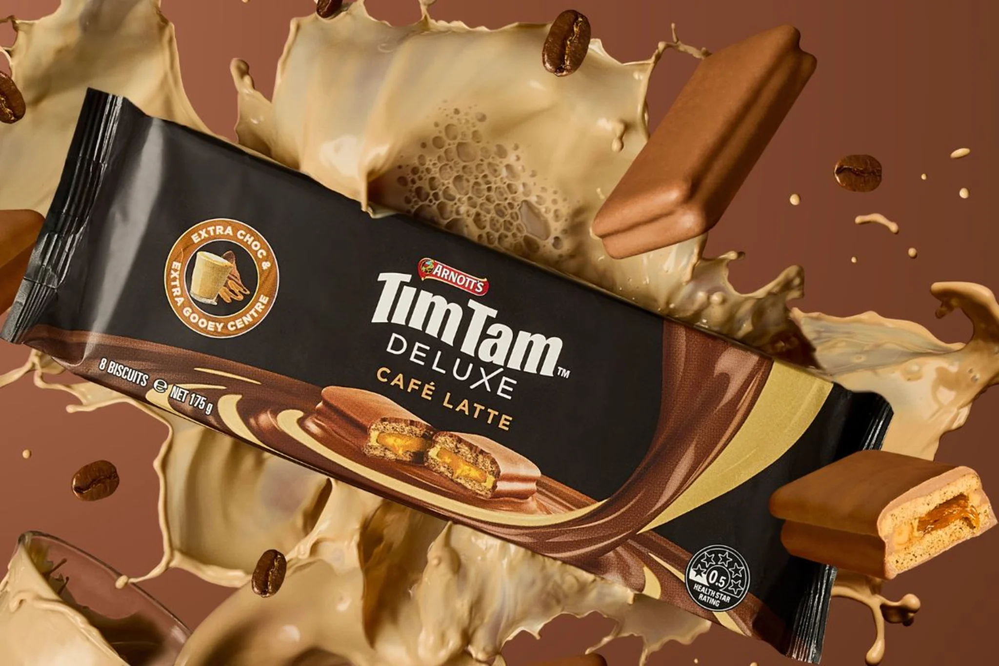 As the perfect complement to your next cuppa, to ‘Bite, Sip and Slam’ or simply to indulge on its own, Deluxe Café Latte promises to tingle the tastebuds of coffee connoisseurs and chocolate lovers around Australia starting with a delectable caramel coffee aroma. This mouth-watering bikkie combines a smooth blend of chocolate, robust coffee flavours and an extra gooey caramel centre contrasted with the classic Tim Tam crunch, all enrobed in decadent milk chocolate.