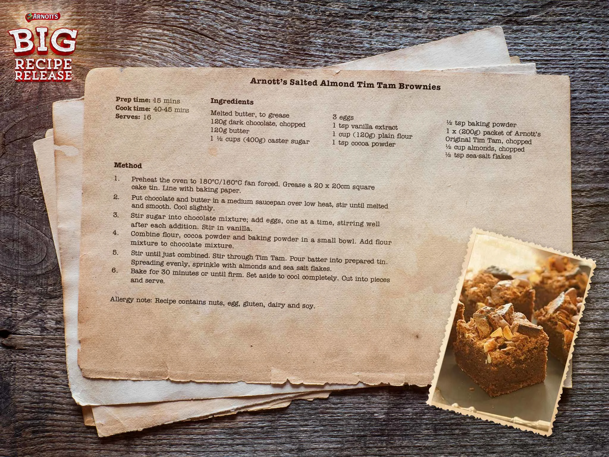 For our fourth Big Recipe Release, we’ve dived deep into our cookbook archives and pulled out an easy, make-at-home recipe that brings us back to the roots of Arnott’s baking heritage (and just in time for World Baking Day on the 17th of May). We even baked a fresh batch in the Arnott's Culinary Center and it’s as delicious as we remember! It’s the perfect ‘warm and fudgy’ recipe to #BakeTogether with your loved ones whilst reigniting your love for the classic Tim Tam. Enjoy!
