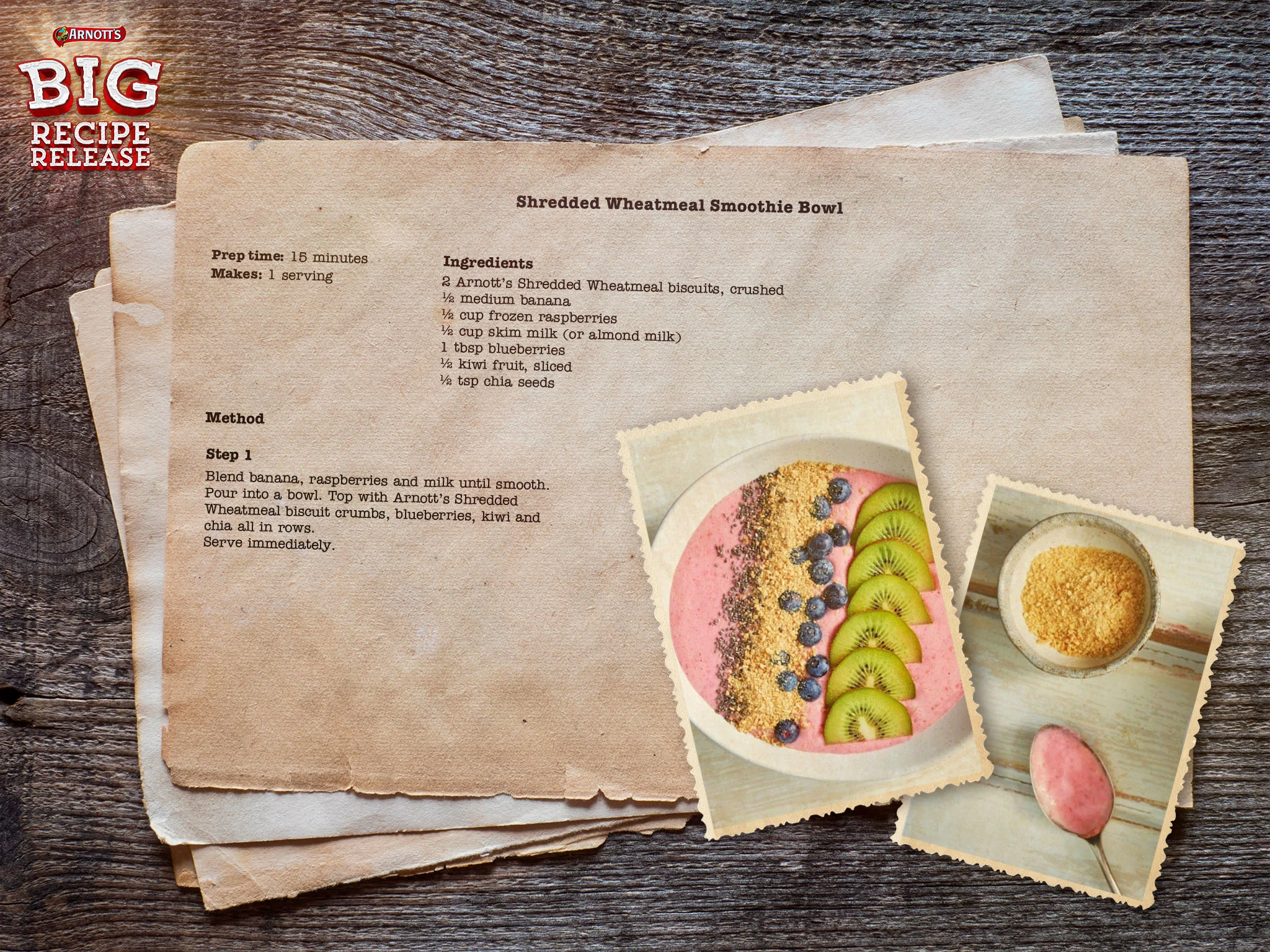 Want to give your brekkie or brunch a wholesome boost? Break out the blender and give the delicious (and photogenic) Shredded Wheatmeal Smoothie Bowl a whirl! Quick and easy to make, this nourishing bowl is filled with fruit and sprinkled with the yummy crunch of crushed Arnott’s Shredded Wheatmeal bikkies.