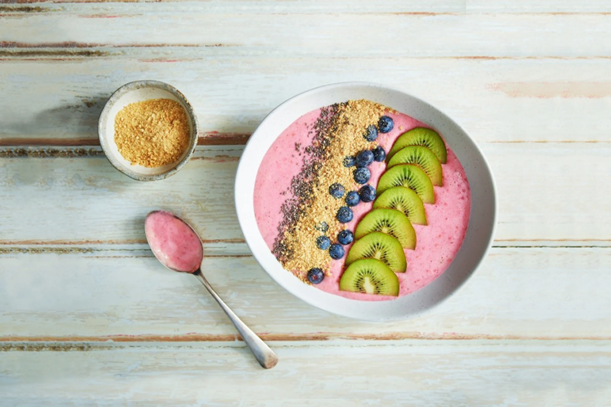 Blend banana, raspberries and milk until smooth. Pour into a bowl. Top with Arnott’s Shredded Wheatmeal biscuit crumbs, blueberries, kiwi and chia all in rows. Serve immediately.